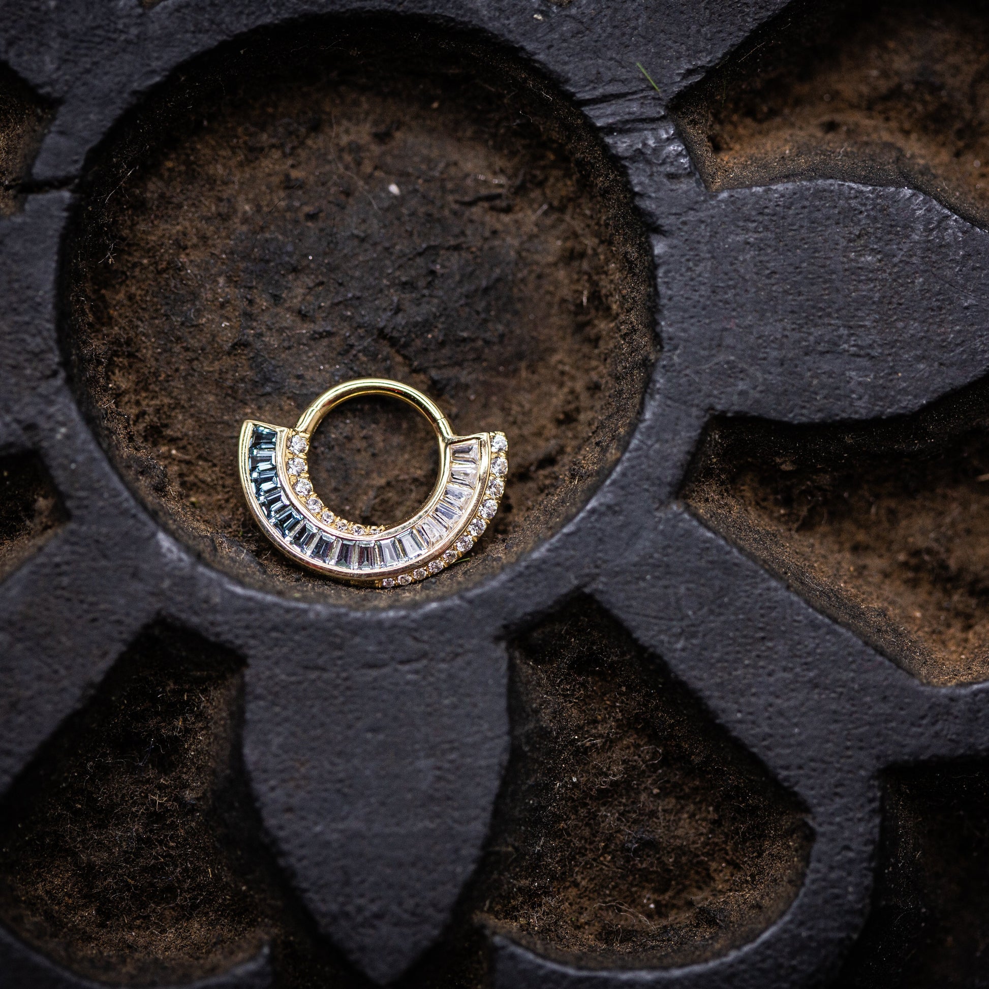 Buddha Jewelry's signature design perfect for a variety of ear and facial piercings! This piece features genuine tapered baguette London Blue Topaz and white CZ.
