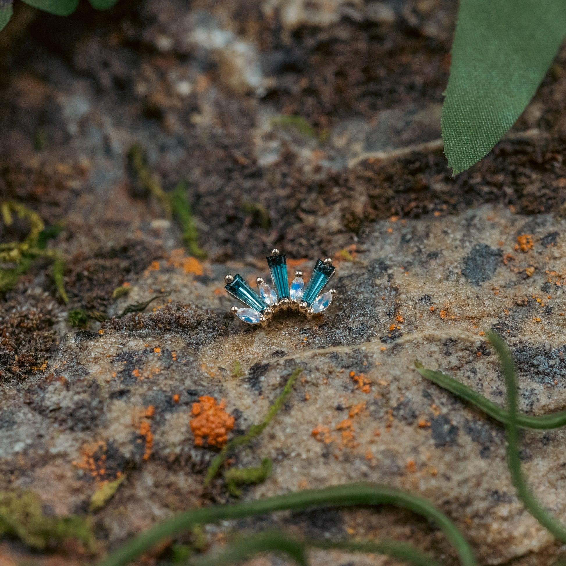 BVLA's new design perfect for helix and lobe piercings! This piece features 7 Alternating Tapered Baguette and Marquise cut Light Genuine Rainbow Moonstone & London Blue Topaz.