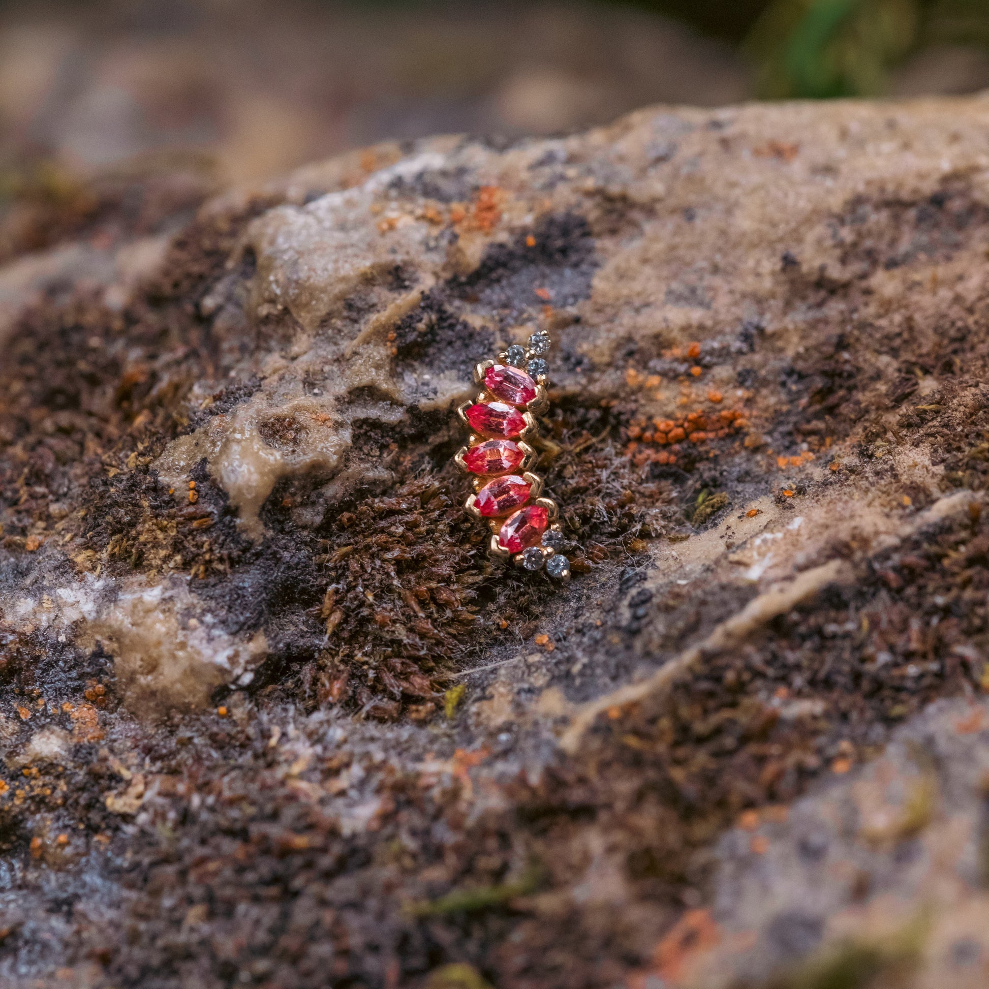 BVLA's new design perfect for helix and lobe piercings! This piece features 6 Grey Diamond & 5 Marquise Padparadscha Sapphire stones.