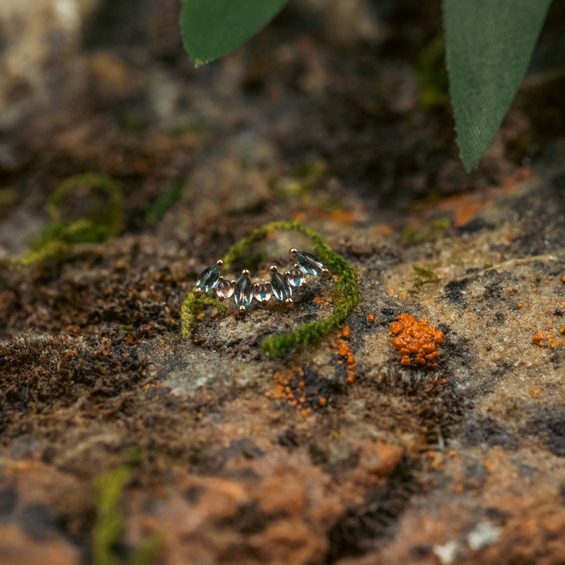 BVLA's new design perfect for helix and lobe piercings! This piece features 4 Marquise Swiss Blue Topaz & 3 Rainbow Moonstone.