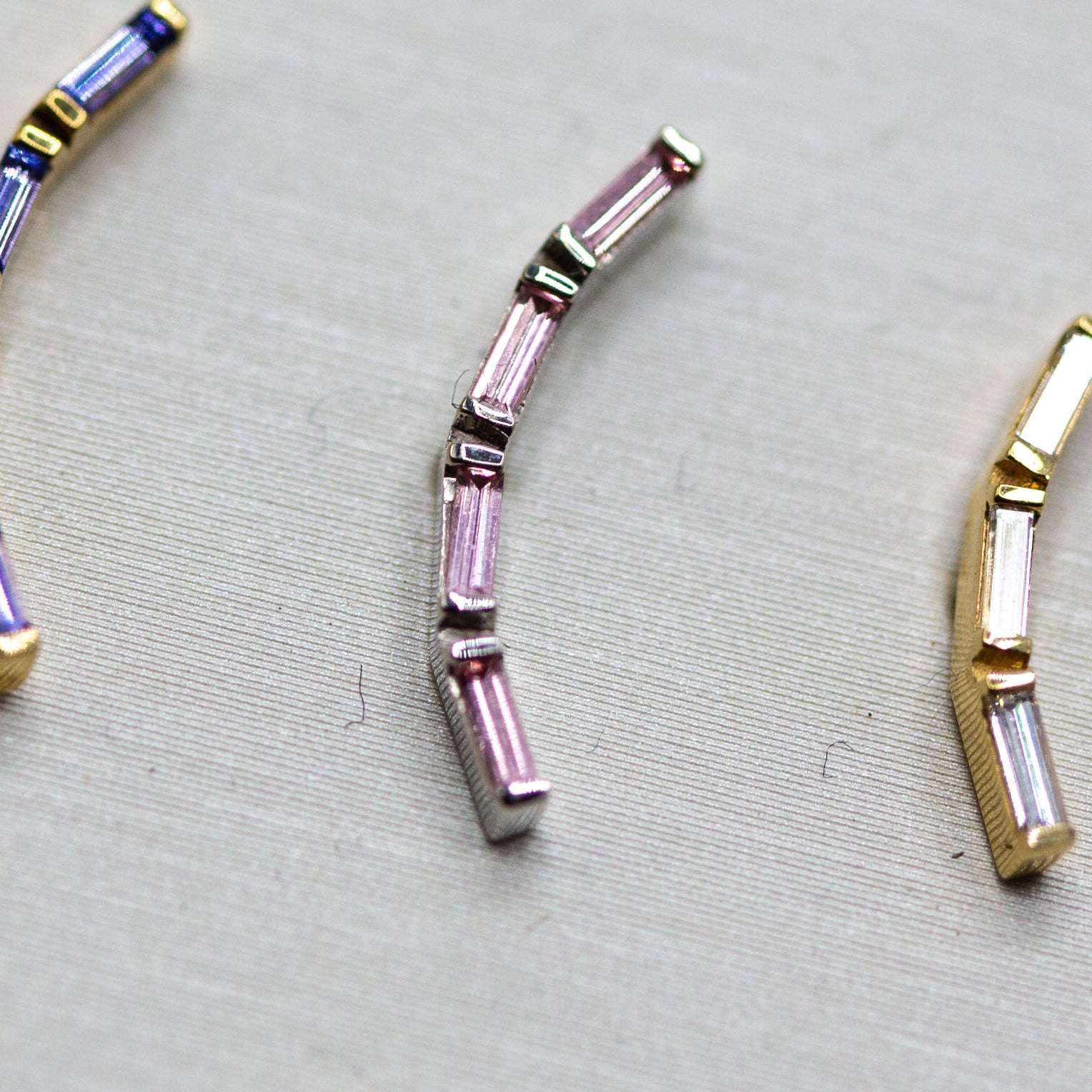 BVLA's new design perfect for helix and lobe piercings! This piece features 4 Padparadscha Sapphire baguette cut gemstones. For the perfect balance of color and class.