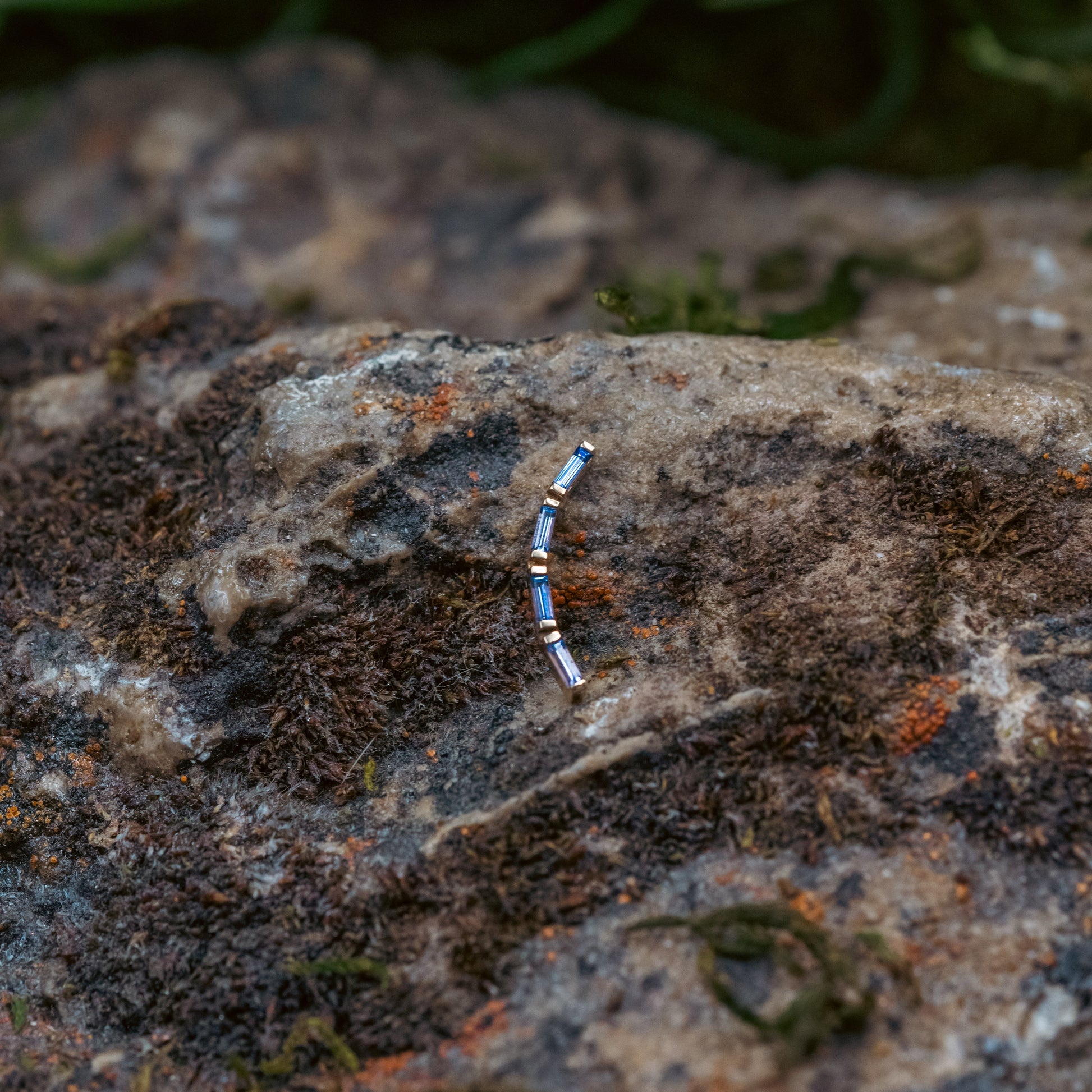 BVLA's new design perfect for helix and lobe piercings! This piece features 4 Tanzanite baguette cut gemstones. For the perfect balance of color and class.