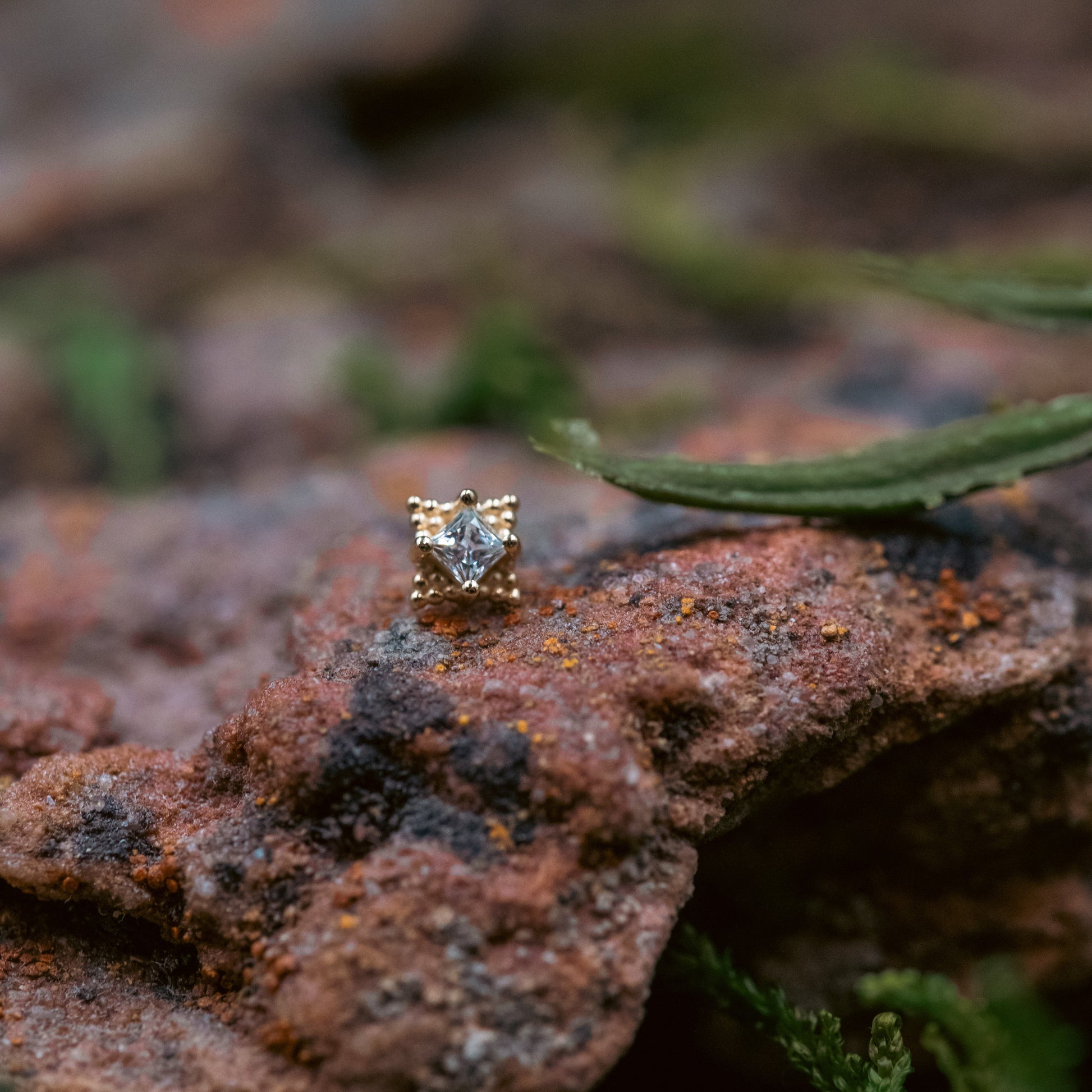 This design is perfect for a variety of ear and facial piercings! This piece features a White CZ set in solid Gold with beaded accents.