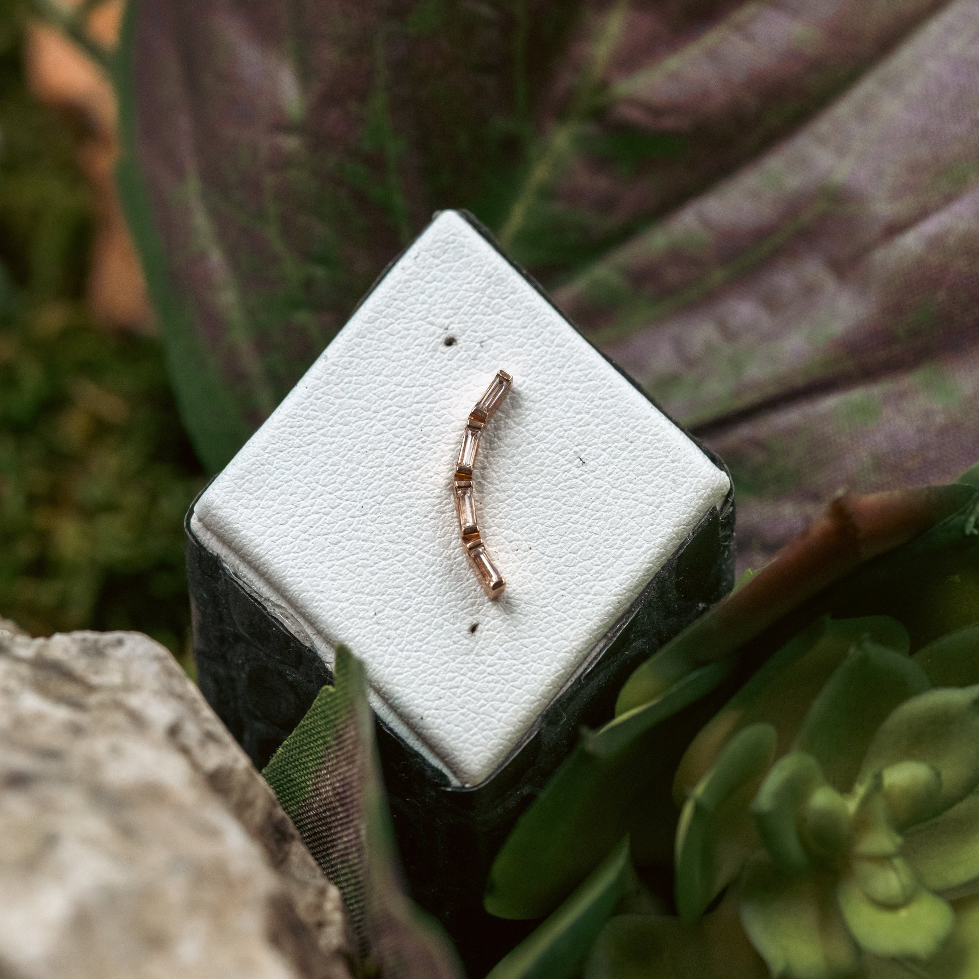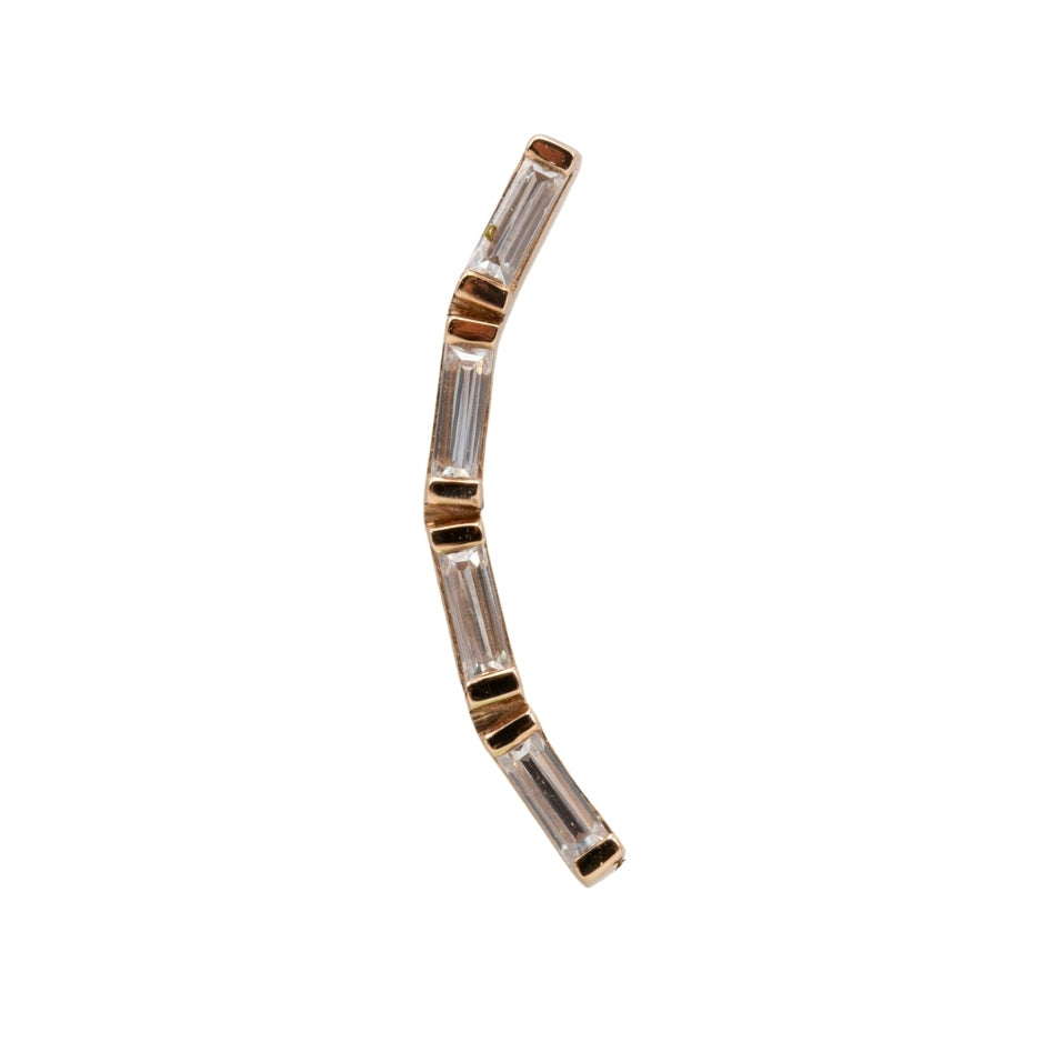 BVLA's new design perfect for helix and lobe piercings! This piece features 4 white CZ baguette cut gemstones. For the perfect balance of color and class.