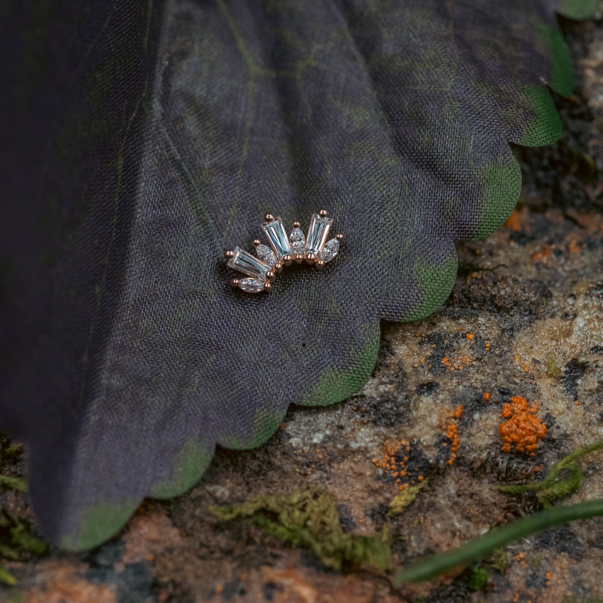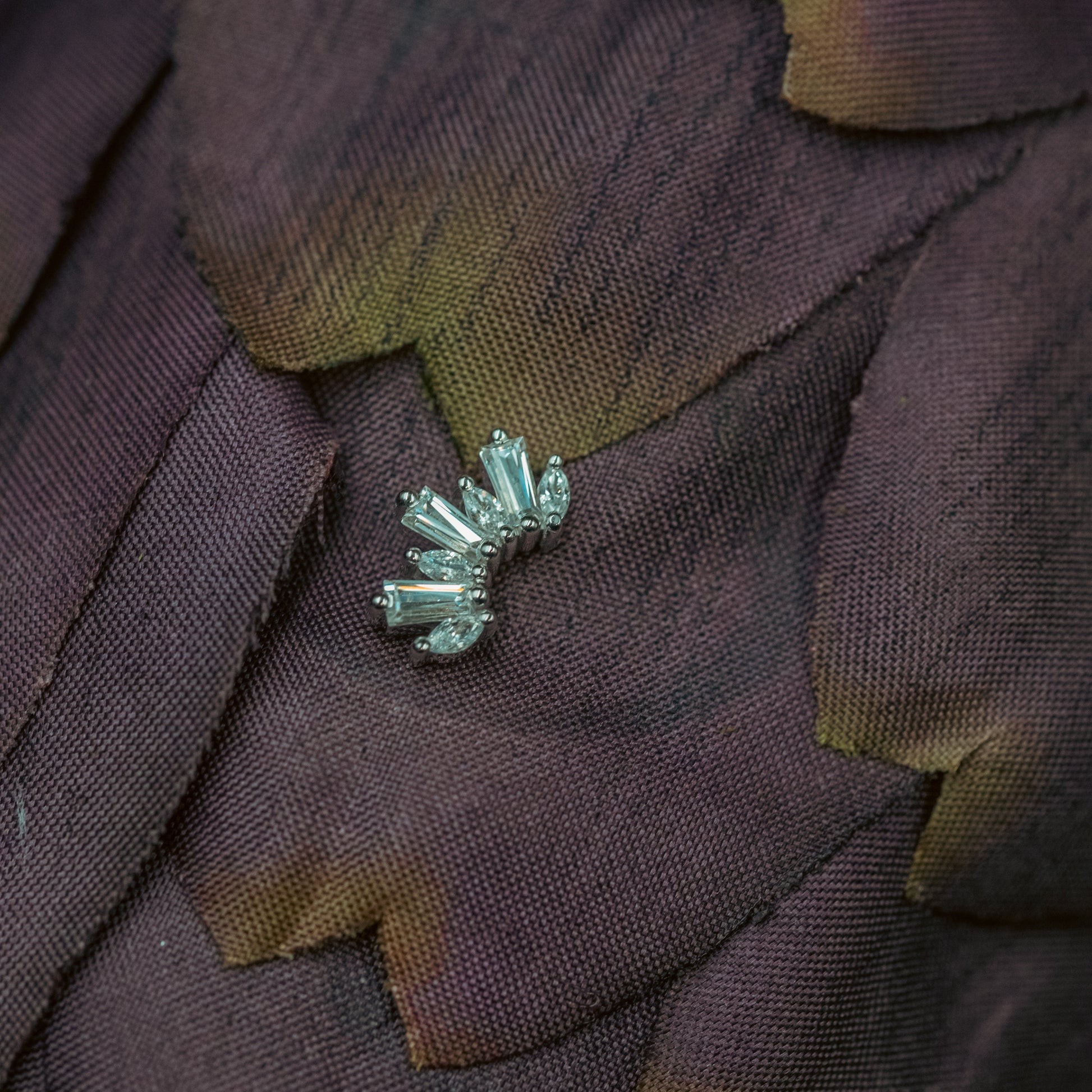 BVLA's new design perfect for helix and lobe piercings! This piece features 7 Alternating Tapered Baguette and Marquise cut White Cubic Zirconia
